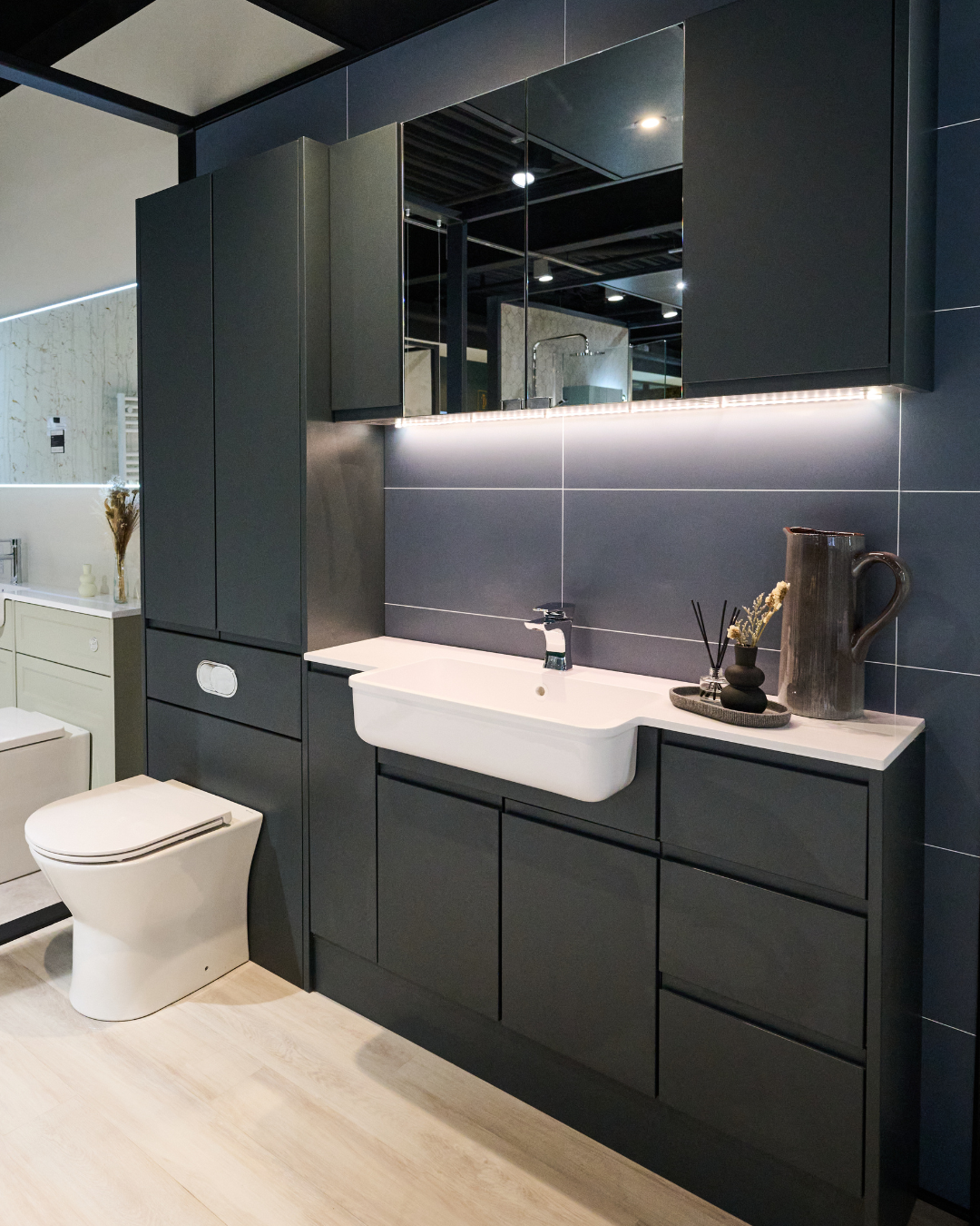 This display showcases a beautifully coordinated bathroom layout with sleek dark cabinetry, a crisp basin, soft underlighting, and smart storage solutions.