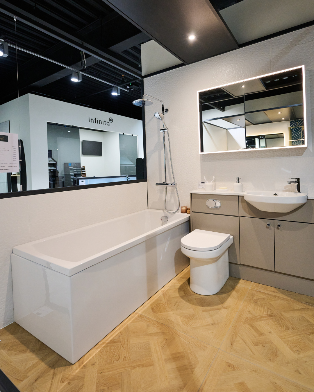 Every component of this display helps create a bathroom that’s functional for busy mornings and relaxing evenings. From the fitted furniture to the practical bath and shower combination, this display shows how great design delivers lasting convenience.